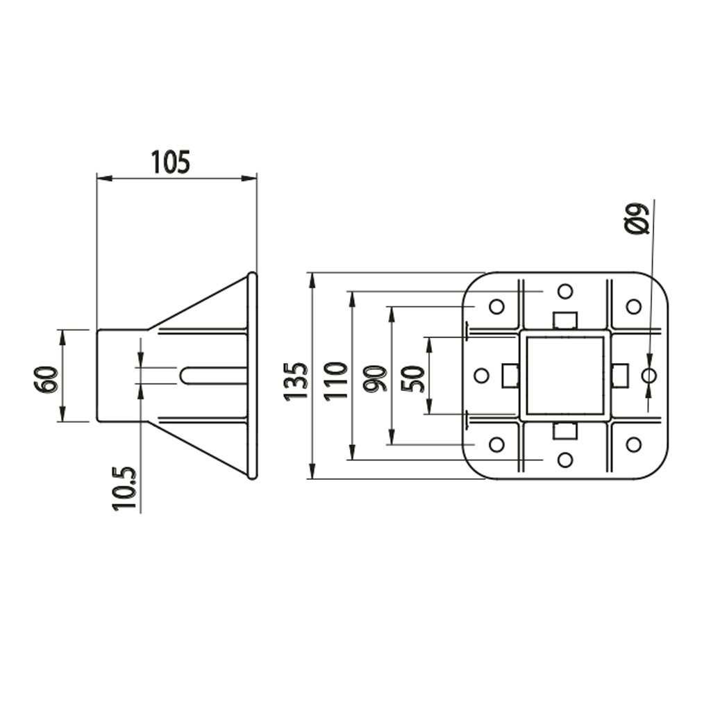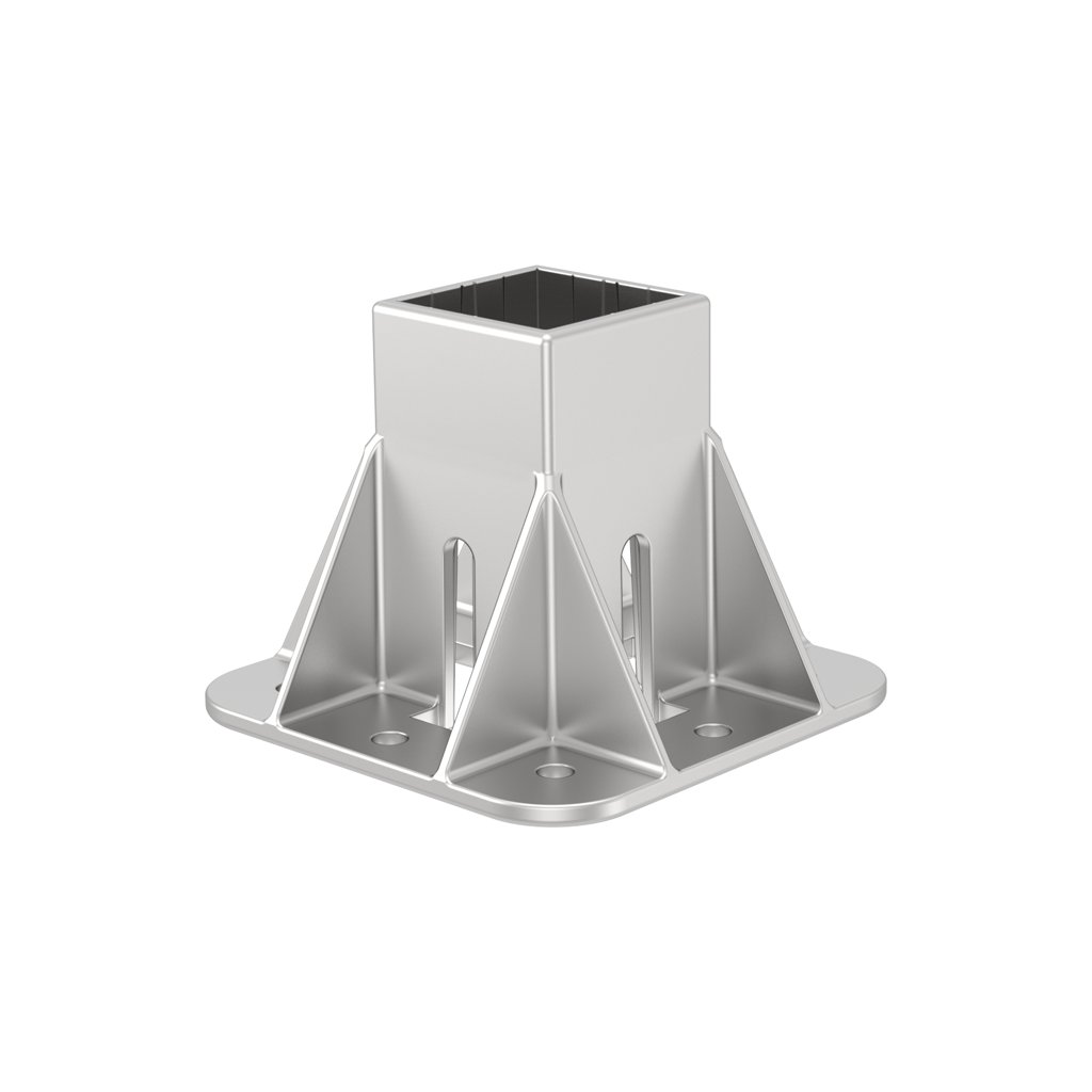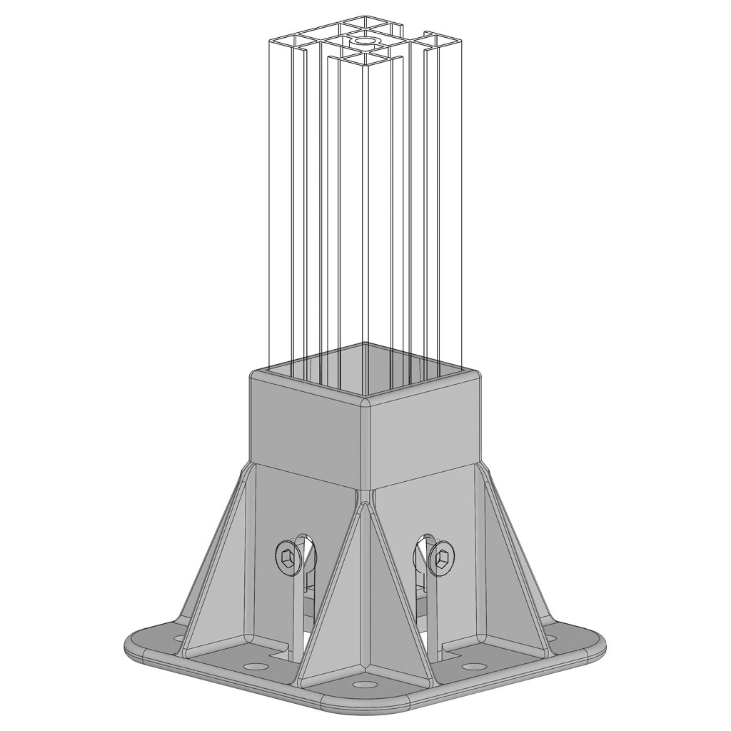Čtyřhranný podstavec o ploše podlahy 135x135 mm určený pro montáž na profily s řezem 50x50.