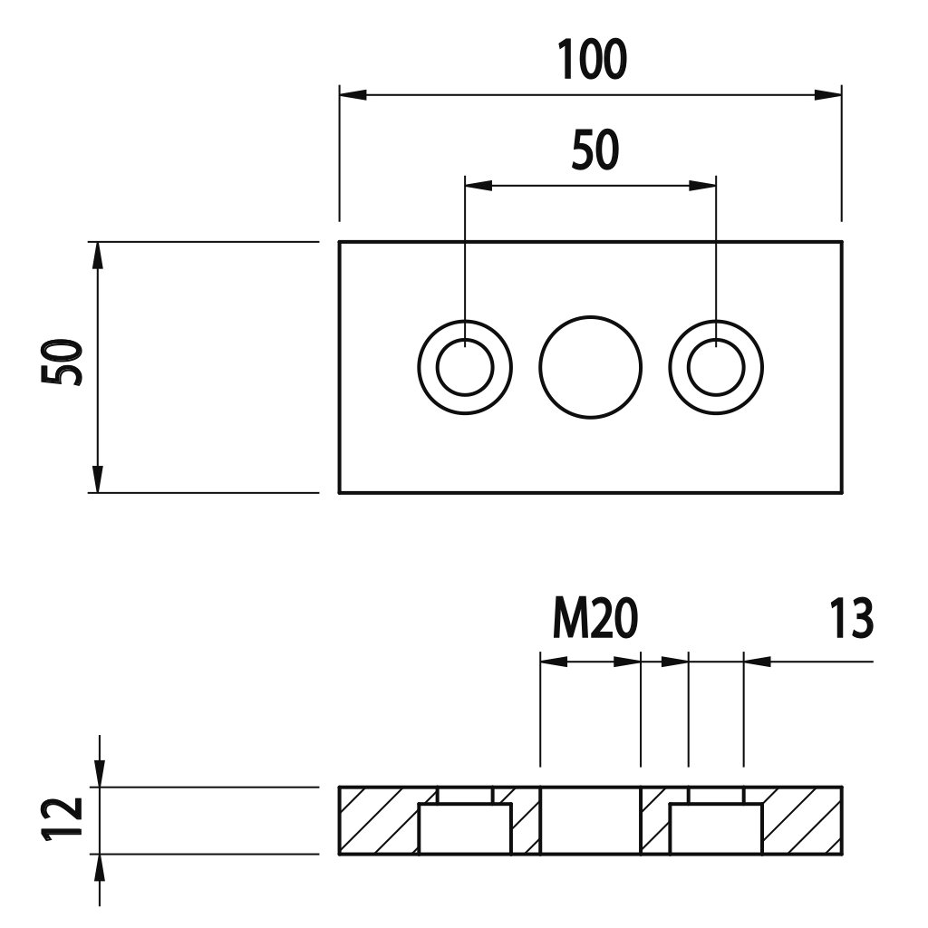 Příruba určená pro montáž podstavce nebo kolečka se závitem M20 k profilu s řezem 50x100.
