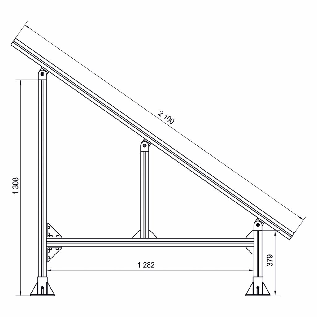 Varianta produktu s optimálním úhlem sklonu 35° a s instalačním profilem 2100 mm pro montáž jedné až tří řad panelů.
