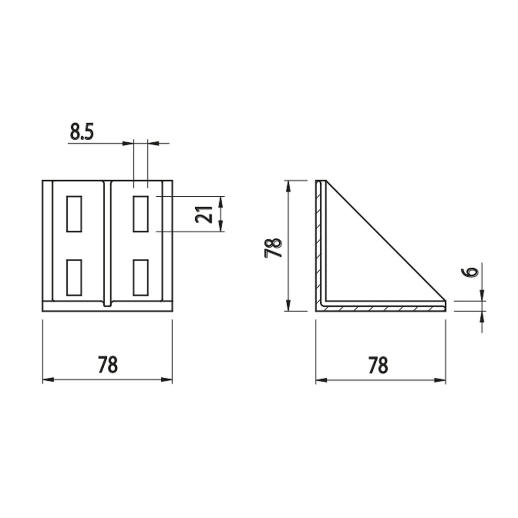 Univerzální úhelník s úhlem 90° a rozměry 78x78 pro spojování profilů z vnější strany pomocí šroubů M8x20.