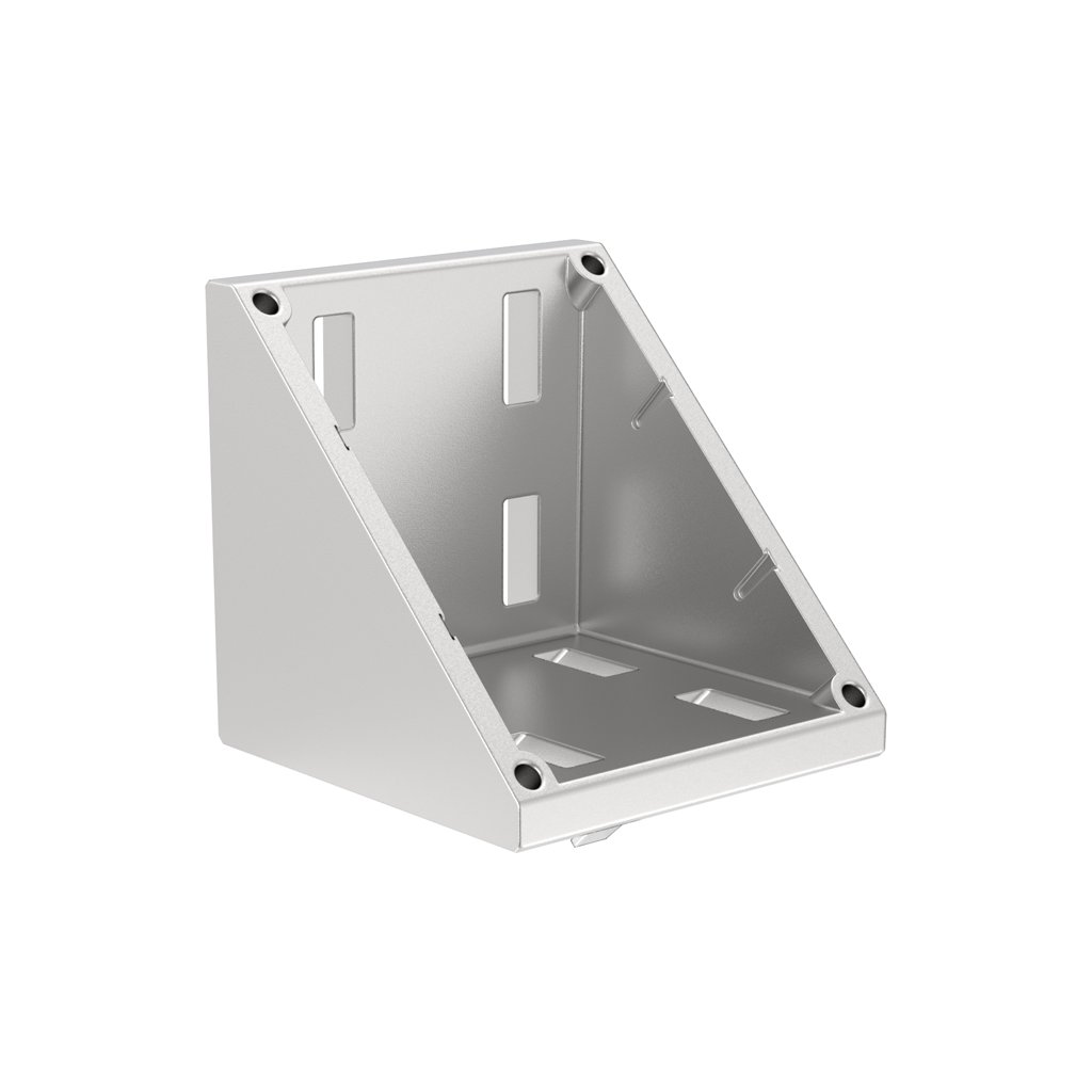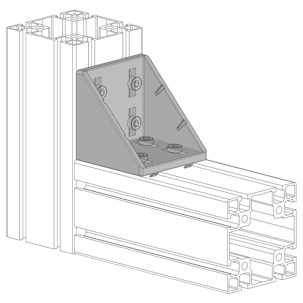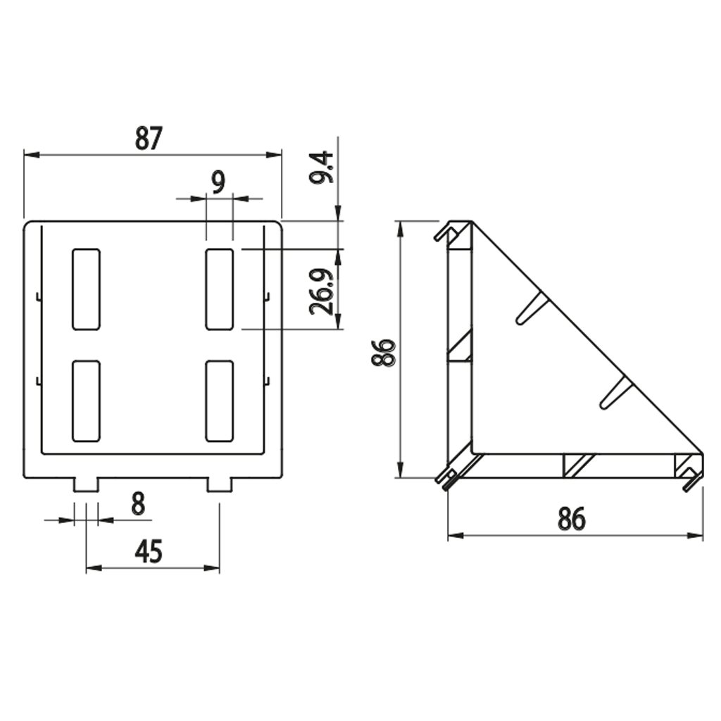Univerzální úhelník s úhlem 90° a rozměry 86x86 pro spojování profilů z vnější strany pomocí šroubů M8x20.