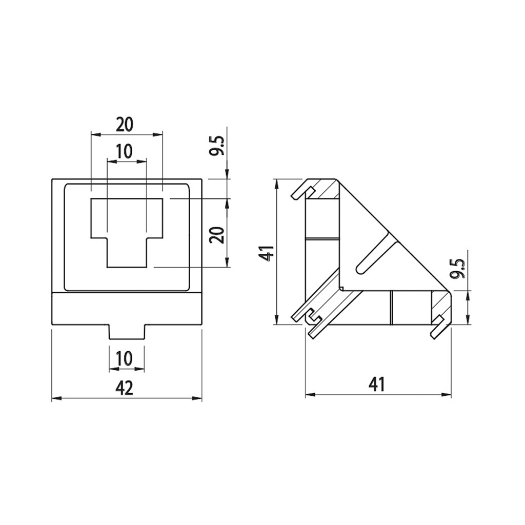 Univerzální úhelník s úhlem 90° a rozměry 42x41 pro spojování profilů z vnější strany pomocí šroubů M8x20.