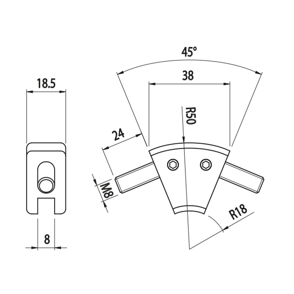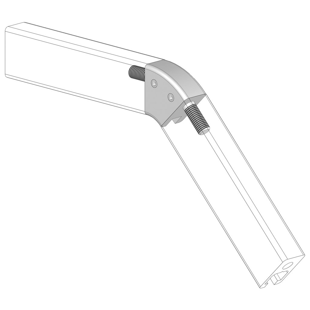 Úhlová spojka pro spojování profilů série AC 45-8 s řezem 18,5x32 pod úhlem 45°.