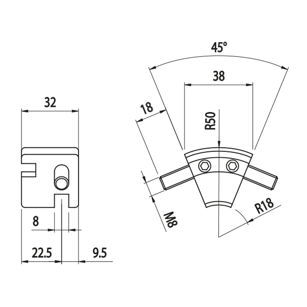 Úhlová spojka pro spojování profilů série AC 45-8 s řezem 32x32 pod úhlem 45°.