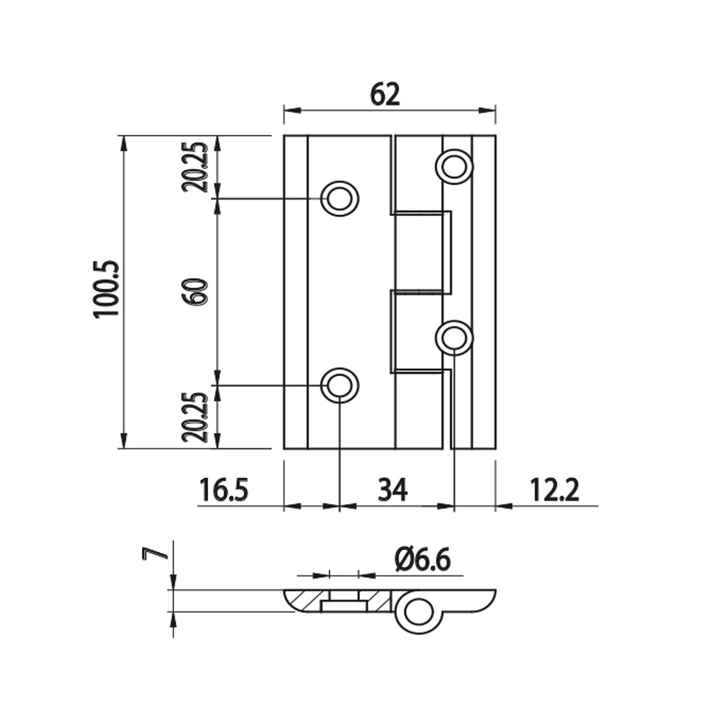 Hliníkový závěs s výškou 100,5 mm a celkovou šířkou 62 mm.