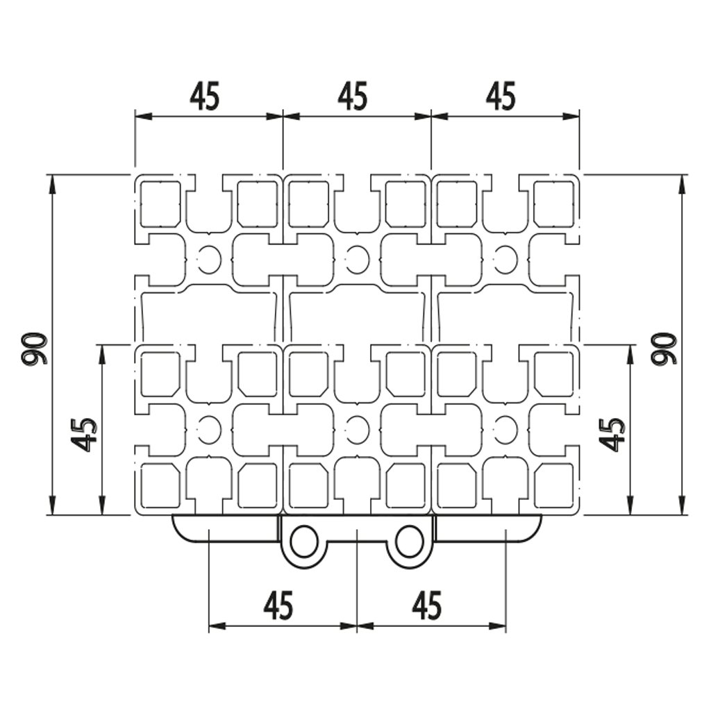 Vhodný především pro spojení 3 profilů AC 45-8 s řezy o šířkách 45/45/45 mm.